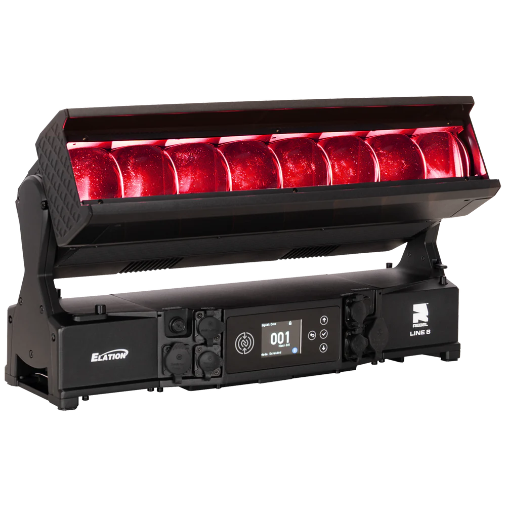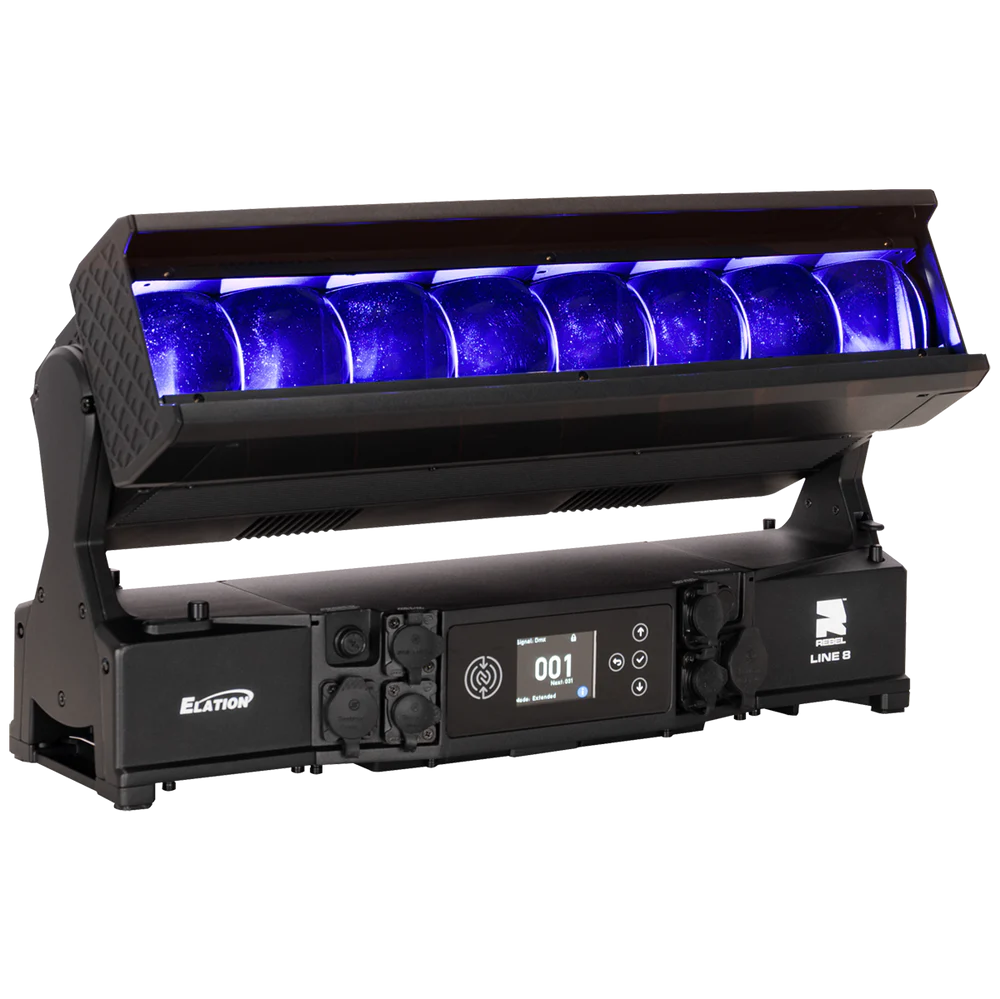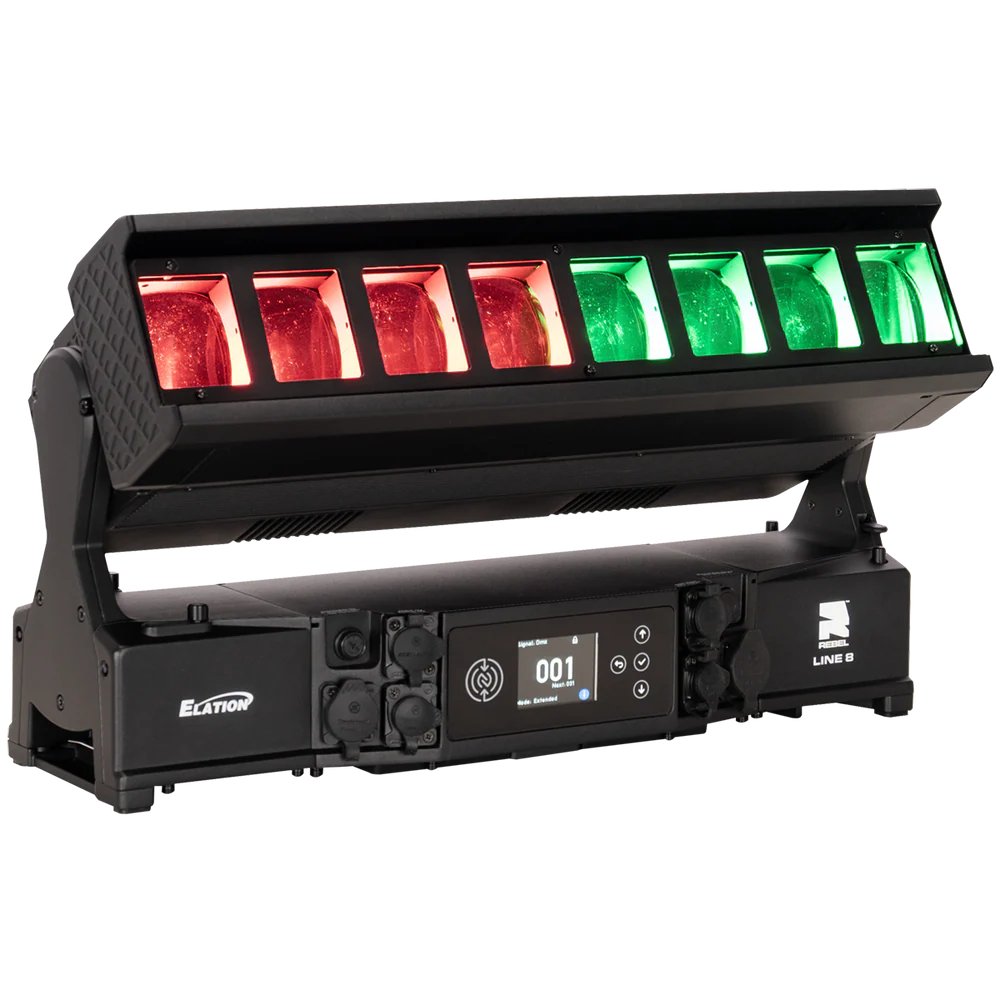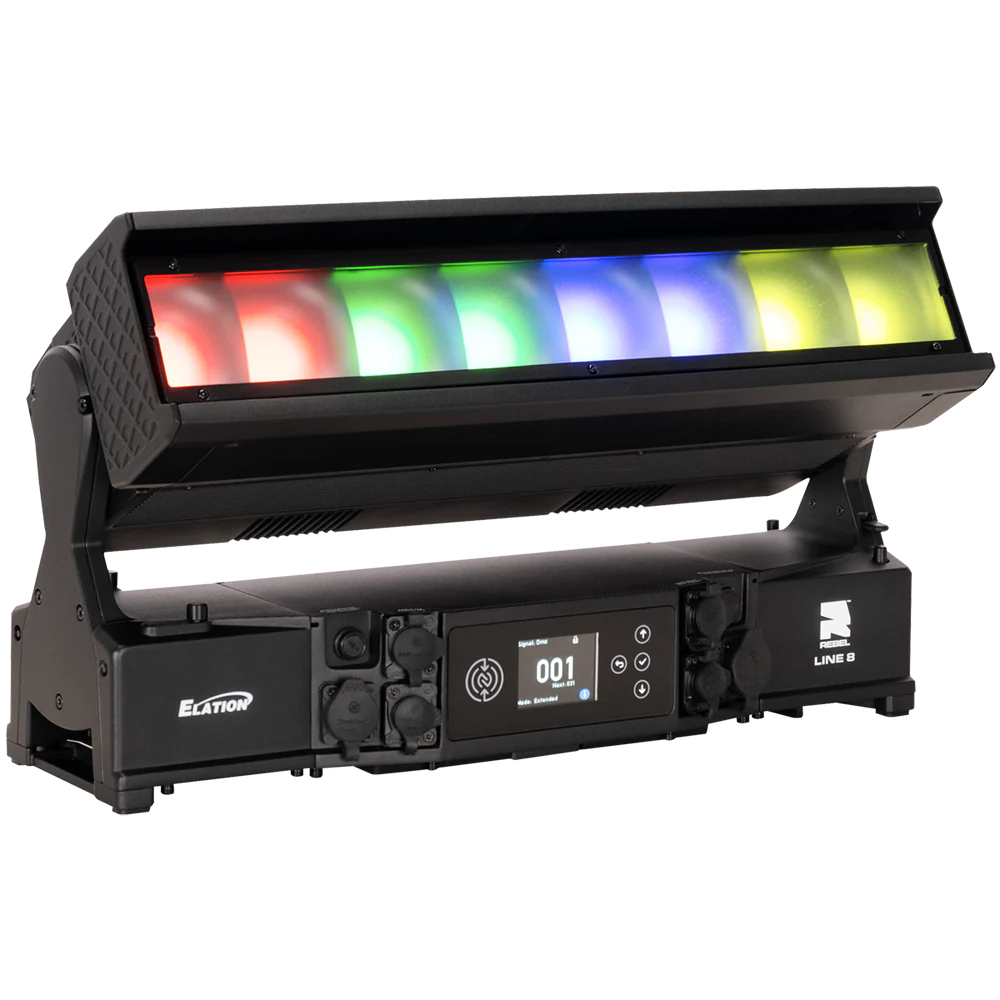 Die REBEL LINE 8 von ELATION ist eine linear aufgebaute, motorisierte LED-Bar für den professionellen Einsatz in Bühnen-, Event- und Architekturbeleuchtung, bei der ein hoher Lichtoutput mit segmentierter Pixelansteuerung kombiniert wird. Das System arbeitet mit 8 RGBL-LED-Engines (je 60 W) und ergänzt diese um 16 kaltweiße SparkX-LED-Pixel (je 5 W), sodass neben einer gleichmäßigen Flächenbeleuchtung auch strukturierte Pixel- und Akzent-Effekte realisierbar sind. Der Gesamtlichtstrom beträgt 11.548 lm und unterstützt Anwendungen von kräftigen Wash-Looks bis zu klar definierten, grafischen Linien- und Pixelbildern – auch über größere Distanzen.