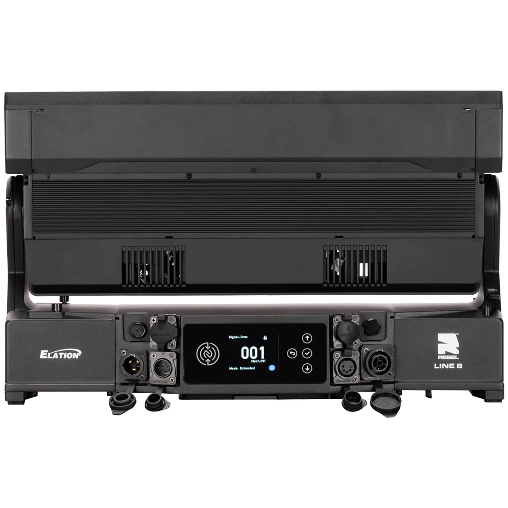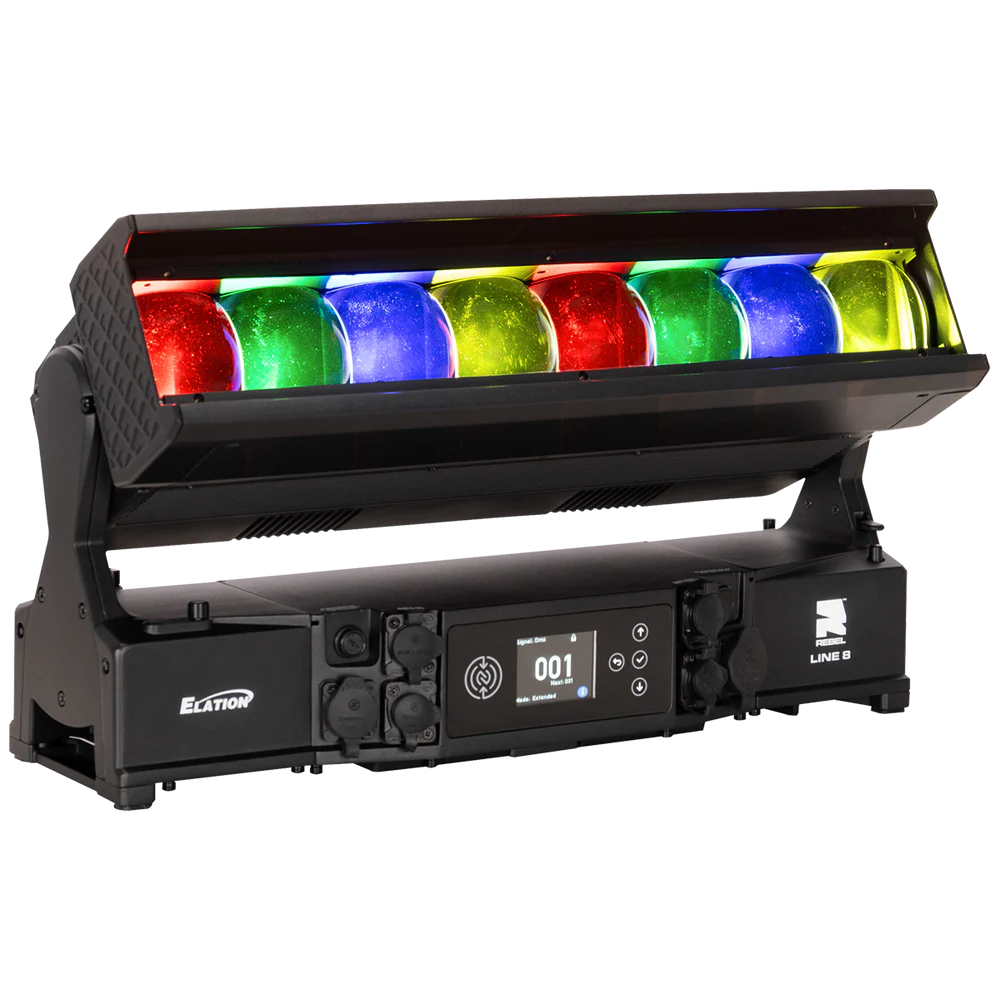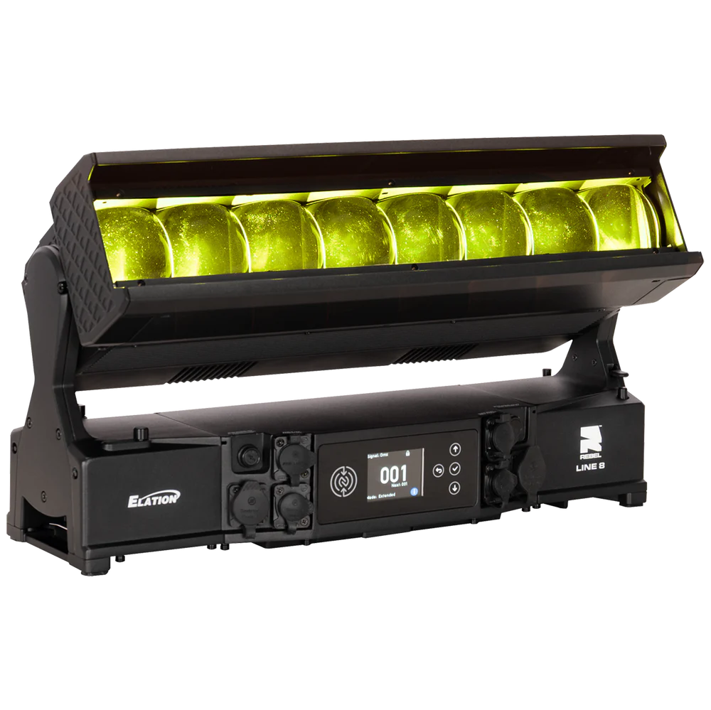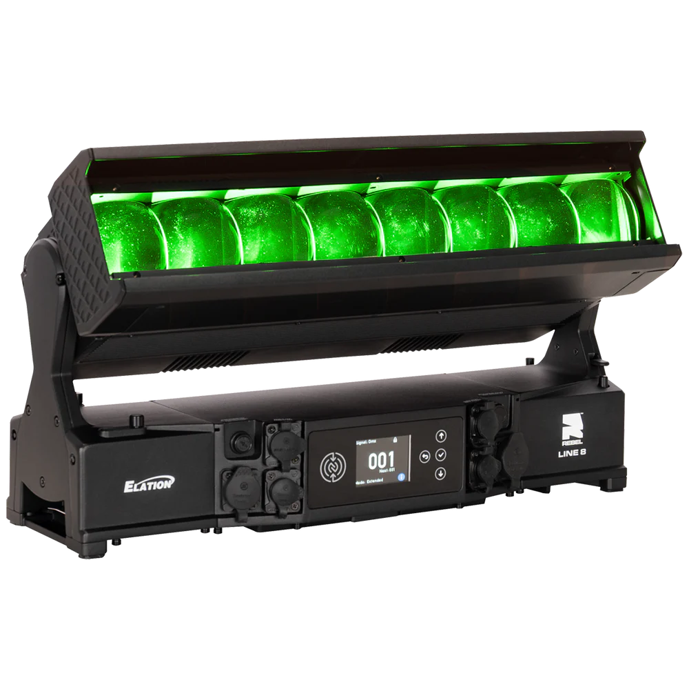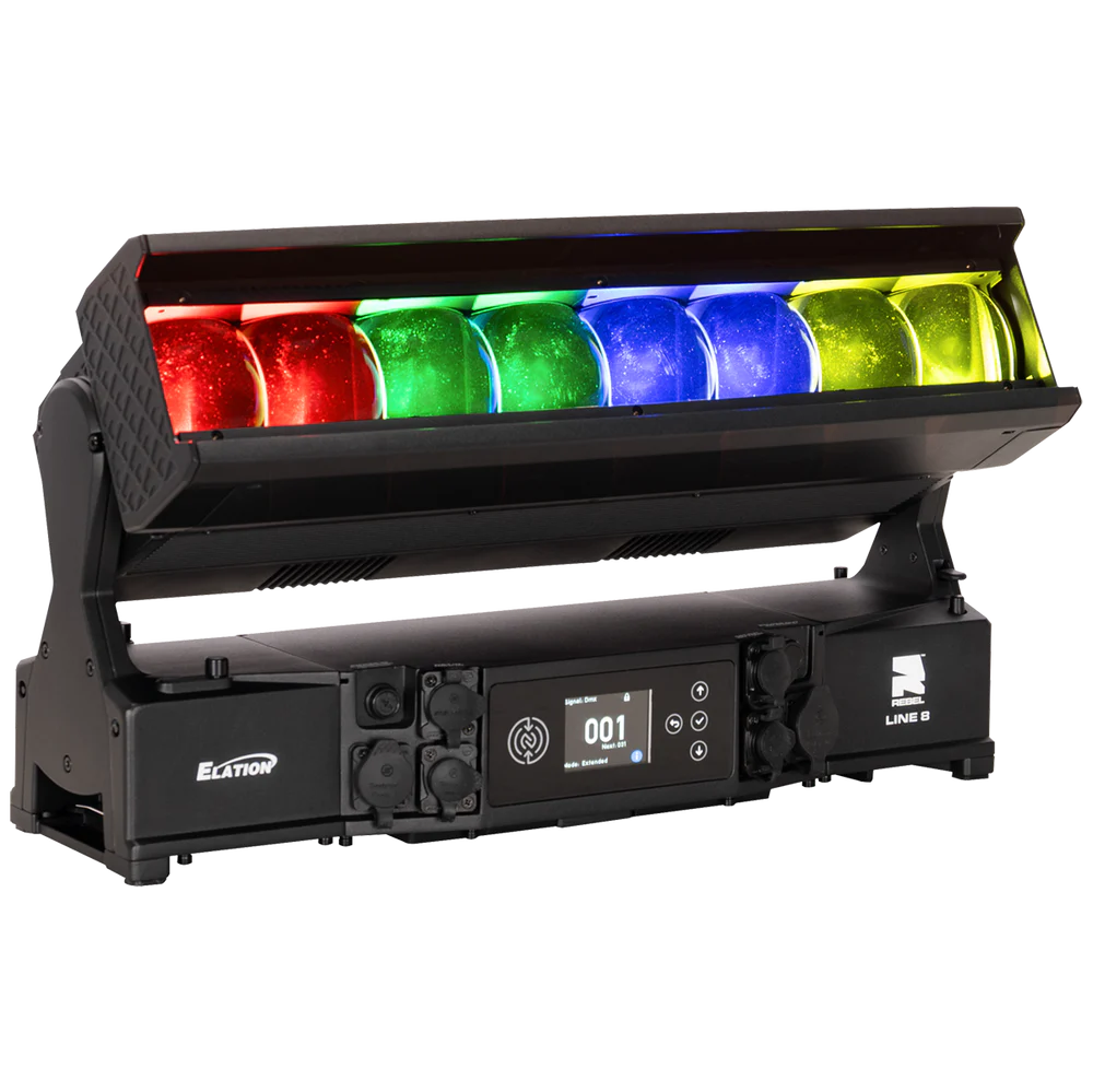 Die REBEL LINE 8 von ELATION ist eine linear aufgebaute, motorisierte LED-Bar für den professionellen Einsatz in Bühnen-, Event- und Architekturbeleuchtung, bei der ein hoher Lichtoutput mit segmentierter Pixelansteuerung kombiniert wird. Das System arbeitet mit 8 RGBL-LED-Engines (je 60 W) und ergänzt diese um 16 kaltweiße SparkX-LED-Pixel (je 5 W), sodass neben einer gleichmäßigen Flächenbeleuchtung auch strukturierte Pixel- und Akzent-Effekte realisierbar sind. Der Gesamtlichtstrom beträgt 11.548 lm und unterstützt Anwendungen von kräftigen Wash-Looks bis zu klar definierten, grafischen Linien- und Pixelbildern – auch über größere Distanzen.